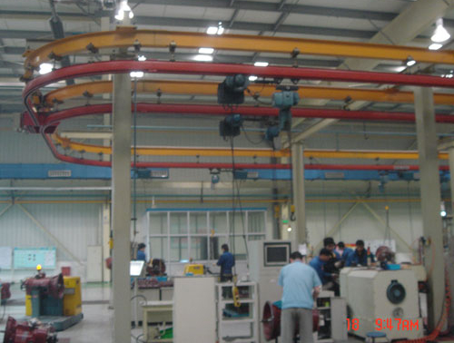 該設(shè)備適用于物料(工件)的線性輸送,根據(jù)用戶對物料輸送的傳遞、分配要求,可以組合成直線的、環(huán)形的、分岔的等多種形式的單軌輸送線網(wǎng)絡(luò)。通過采用直線、彎軌、道岔、轉(zhuǎn)盤實(shí)現(xiàn)軌道上輸送物料的任意走向。實(shí)現(xiàn)往返輸送作業(yè)和環(huán)形輸送作業(yè)。輸送線長度不受限制,可以是簡單的手動控制直線環(huán)形軌道、也可以是多分支的半自動或全自動控制的環(huán)形軌道,并可以實(shí)現(xiàn)全線供電、也可以實(shí)現(xiàn)分段供電,使每一個(gè)運(yùn)行小車均成為自行驅(qū)動行走的輸送單元。